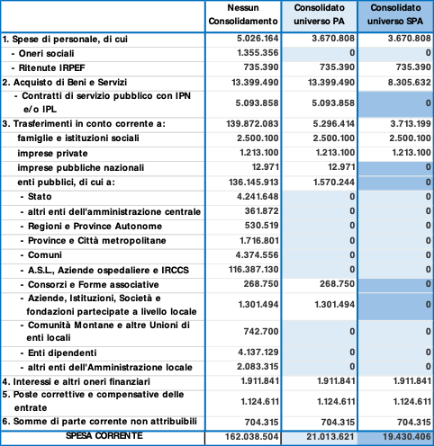 L’esempio seguente, in cui si evidenziano differenti livelli di consolidamento per la spesa corrente riferita ai diversi universi, chiarisce il concetto.